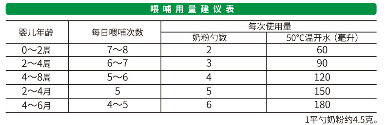 平勺奶粉 依照喂哺用量建議表,加入正確份量(平勺)的奶粉,請勿刻意壓平量勺。